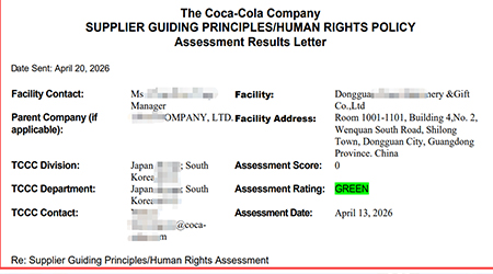 在越南验厂网老师专业技术、全程一对一跟进耐心细致辅导以及公司全体员工配合下,一次性顺利通过可口可乐验厂并取得绿标3年有效期,为将来公司发展奠定了良好的发展基础,既开拓了市场同时也增加了消费者对公司的信赖,在这里再次祝贺东莞思伊文具礼品有限公司2026年一次性成功通过